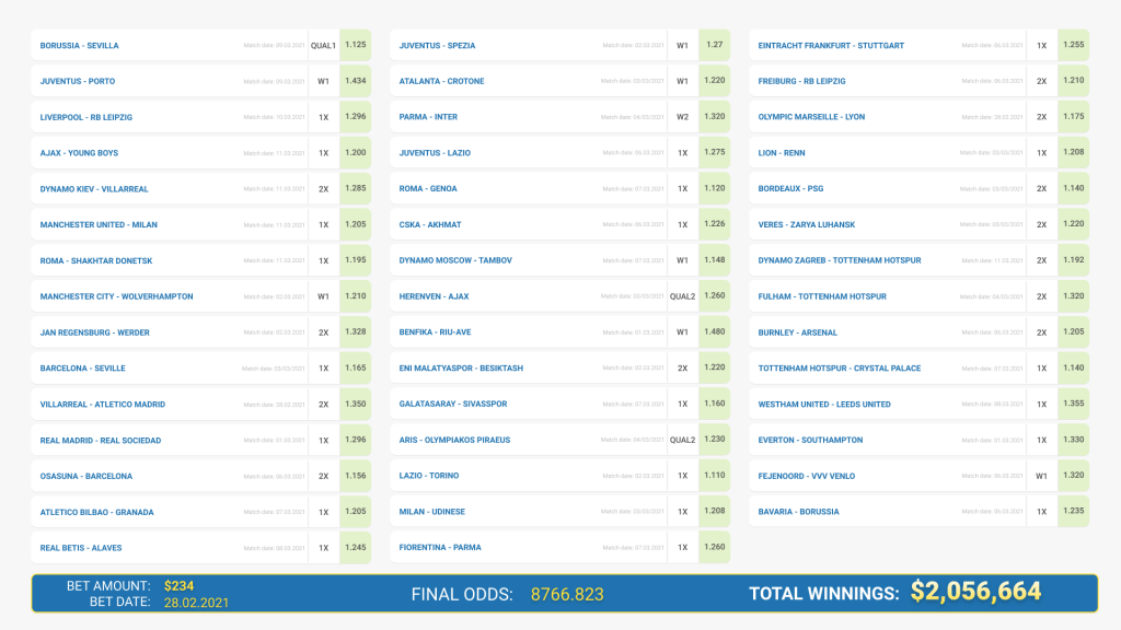 This player placed bets on the website of 1xBet, one of the world’s leading bookmakers, and risked a large sum of 100 thousand tenge (approximately $ 238) on an accumulator comprising of 44 events. Astoundingly, he won, scooping up an incredible 876,682,300 tenge, which is more than 2 million dollars! A fantastic amount that will surely motivate plenty of people to bet at 1xBet.