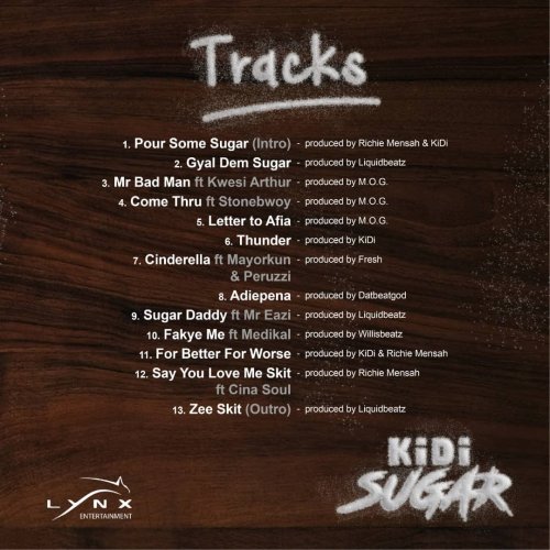 Lynx Entertainment Award Winning versatile HighLife artiste, KiDi unleashes his much anticipated debut album dubbed “Sugar”. The Adiepena hitmaker gives us a 37 Minutes, 13 Track masterpiece which features notable musicians like, Mayorkun, Mr Eazi, Stonebwoy, Kwesi Arthur and others.